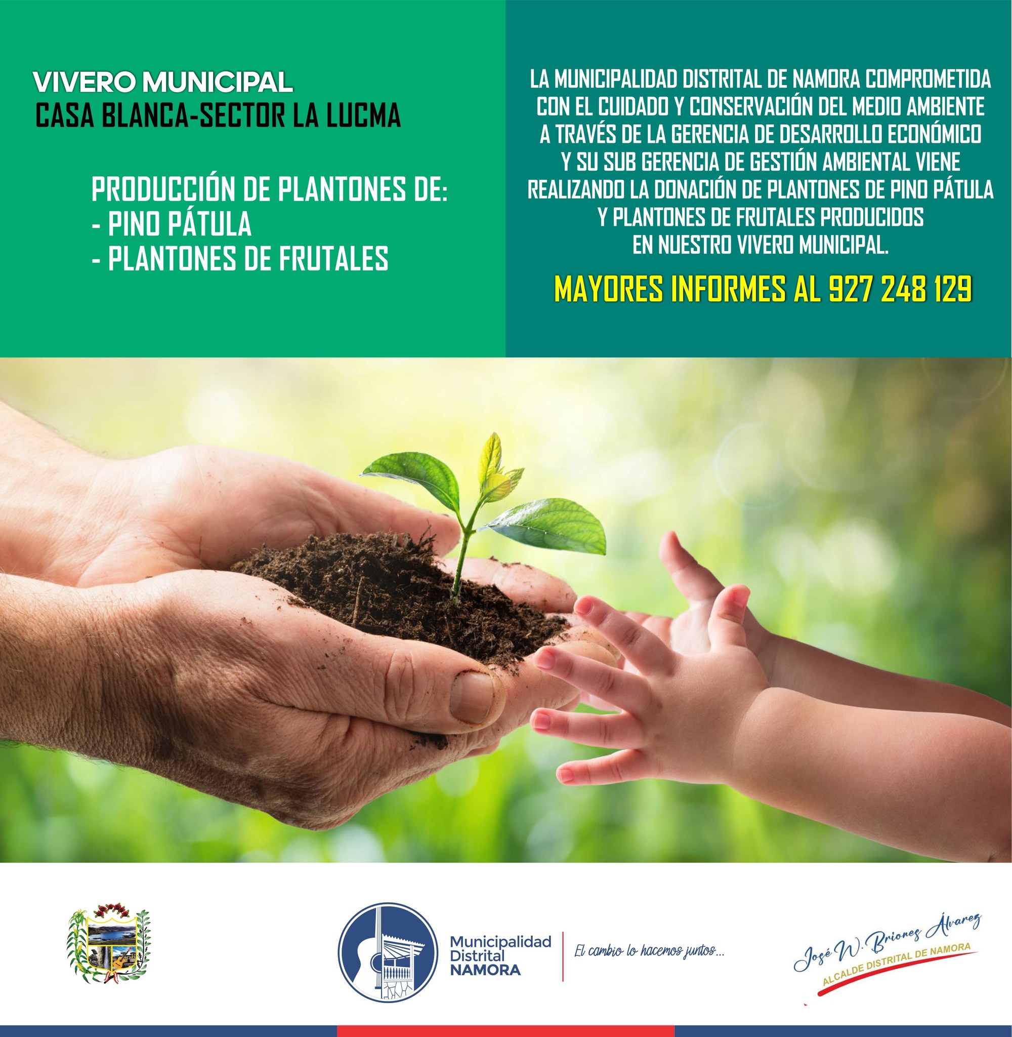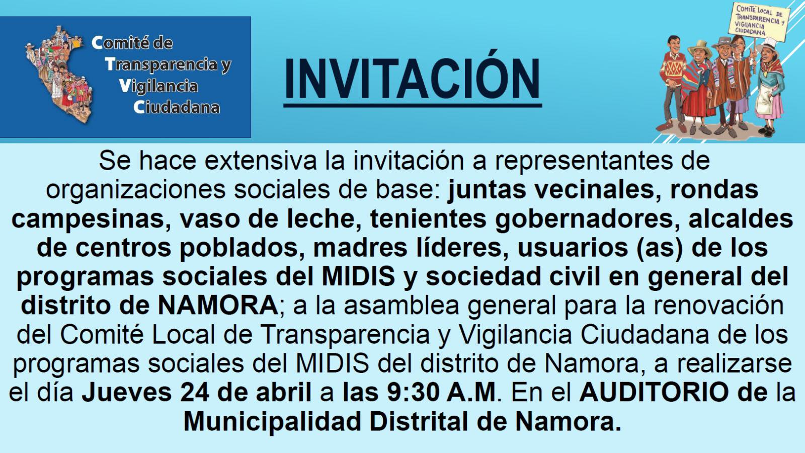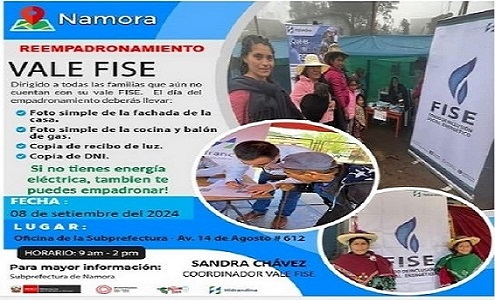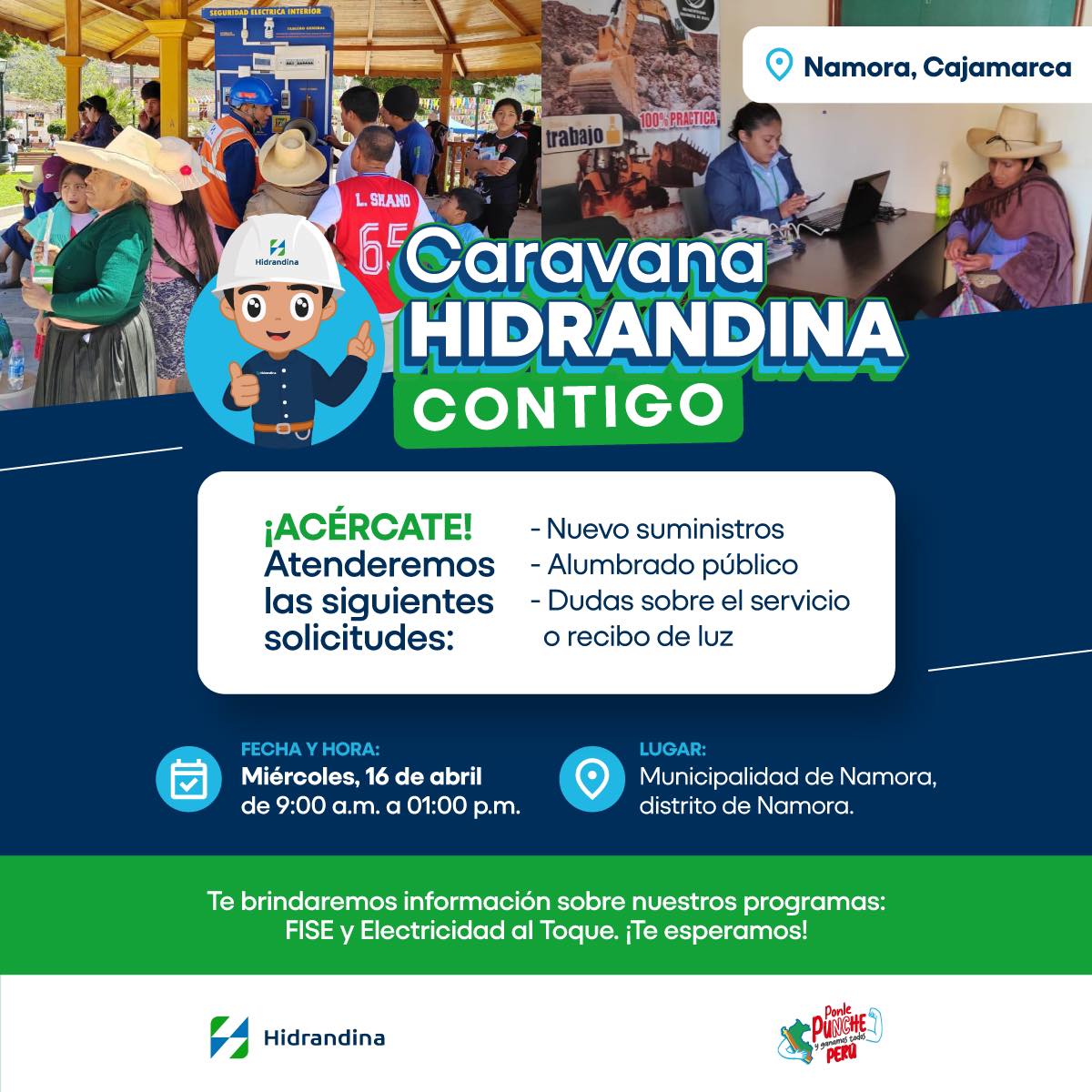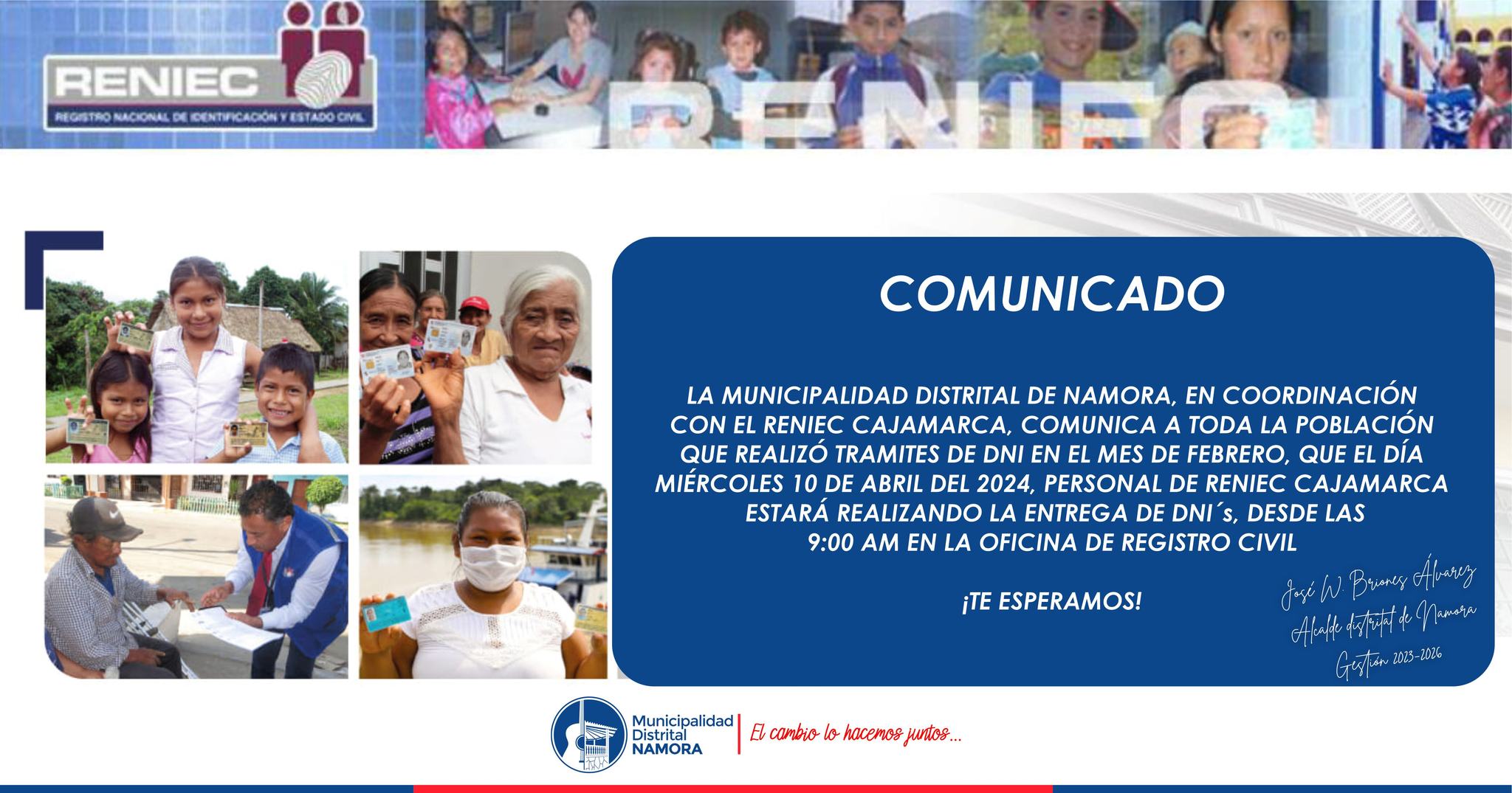 La municipalidad distrital de Namora, liderada por el Ing. José Briones Álvarez a través del trabajo en equipo realizado por la Gerencia de Desarrollo Social, pone a disposición de la población local la Agencia de voluntariado del RENIEC para atender a la población local.